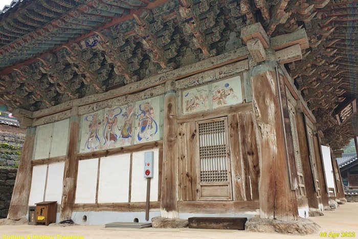 긴 세월 바람과 햇살의 손길로 쓰다듬은 빗꽃 창살과 꽃살무늬 창호에서도 수선거림이 느껴지고. 수많은 인연들이 스쳐 간 듯 손때 묻은 출입문 기둥은 껍질이 벗겨져 목리가 보였다. 우려했던 것이 확인되듯 내부에 단청공사를 하고 있다는 안내문이 붙어 있다.